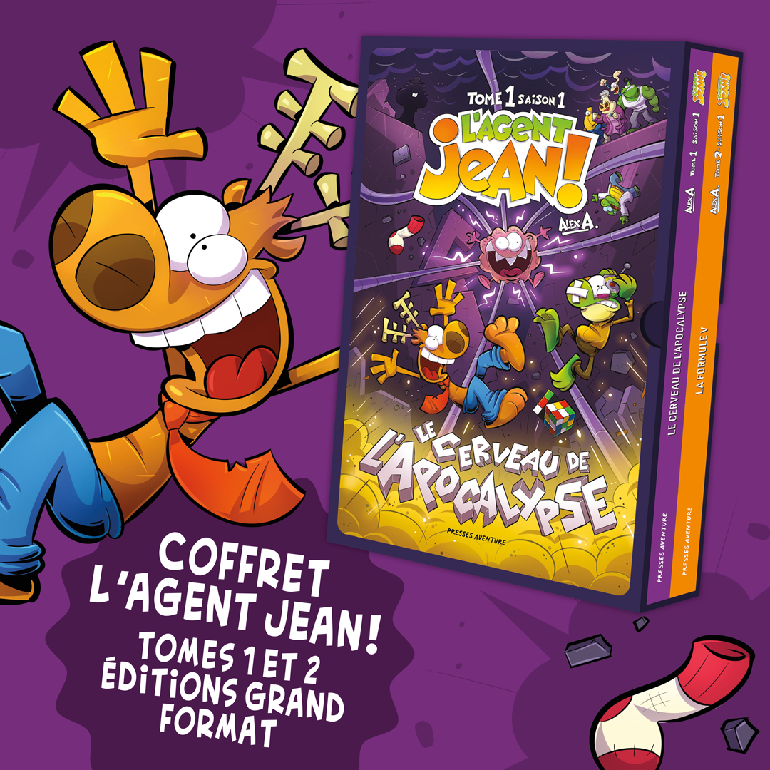 Tout d’abord, un coffret regroupant les deux premiers tomes de L’Agent Jean dans leur édition grand format vient tout juste de paraître. Ces nouvelles éditions ont permis à Alex de revisiter ses livres en y ajoutant du contenu inédit et en retravaillant les couleurs. Ces livres magnifiques rappellent la création des romans graphiques de sa jeunesse ! Le hors-série Les dossiers secrets de Moignons, un des livres préférés des fans, débarquera le 15 novembre ! Celui-ci sera suivi du tome 3 de la saison 1, qui sera publié en grand format au début de l’année prochaine. Ce sera l’occasion pour Alex A. de revoir de fond en comble ce tome mémorable qui nous plonge dans les souvenirs de monsieur Moignons.