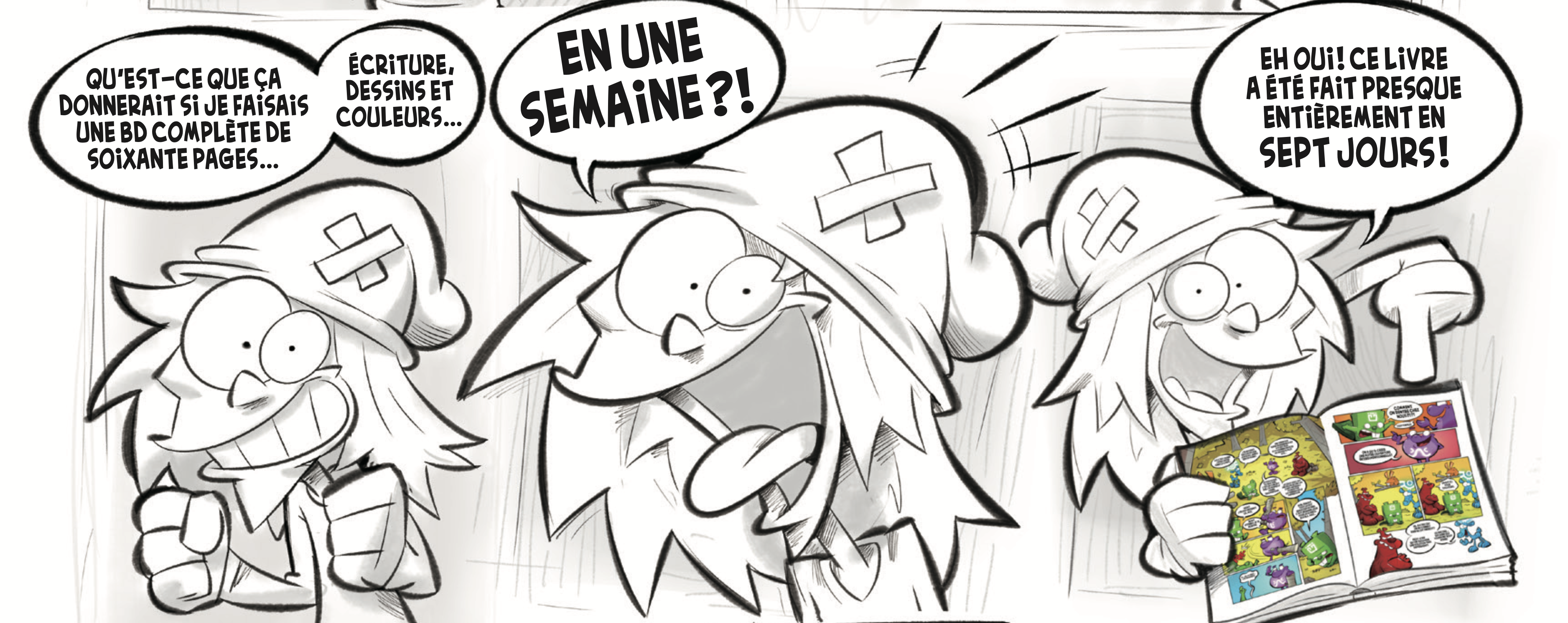 L’album Les étranges est né d’un défi créatif des plus audacieux que l’auteur s’est imposé à lui-même : Suis-je capable de créer une BD complète de 60 pages – écriture, dessins et couleurs – en une semaine seulement ? L’introduction du livre raconte ce processus singulier au cours duquel il s’est isolé dans son chalet pour élaborer sa bande dessinée en 7 jours (sans compter quelques ajouts et les étapes de correction, bien entendu). Défi relevé ! Vous pouvez d’ailleurs en apprendre davantage sur cette création hors du commun dans cette vidéo d’Alex A. qui relate son processus créatif.