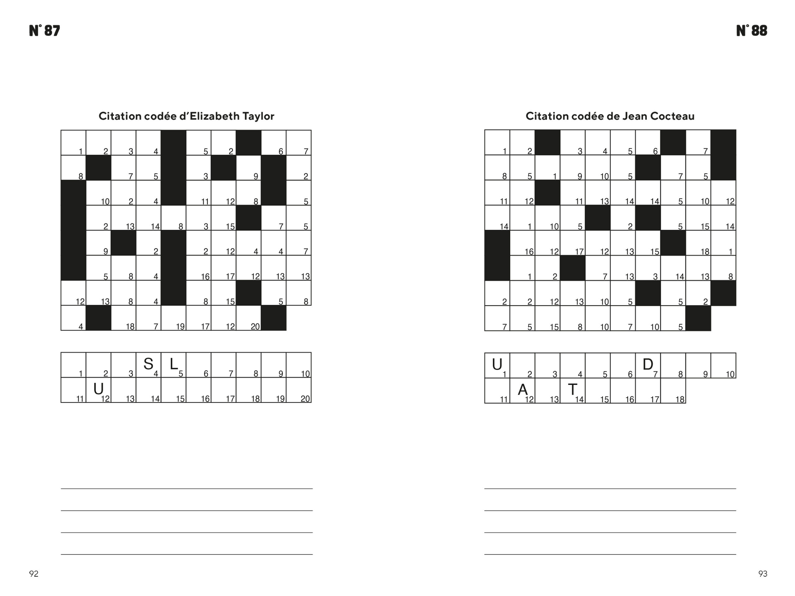 Décodez les citations amusantes lettre par lettre! Les citations codées combinent le concept des citations secrètes et celui des mots codés. Chaque nombre correspond à une lettre qu'on doit inscrire dans la grille pour trouver la citations.