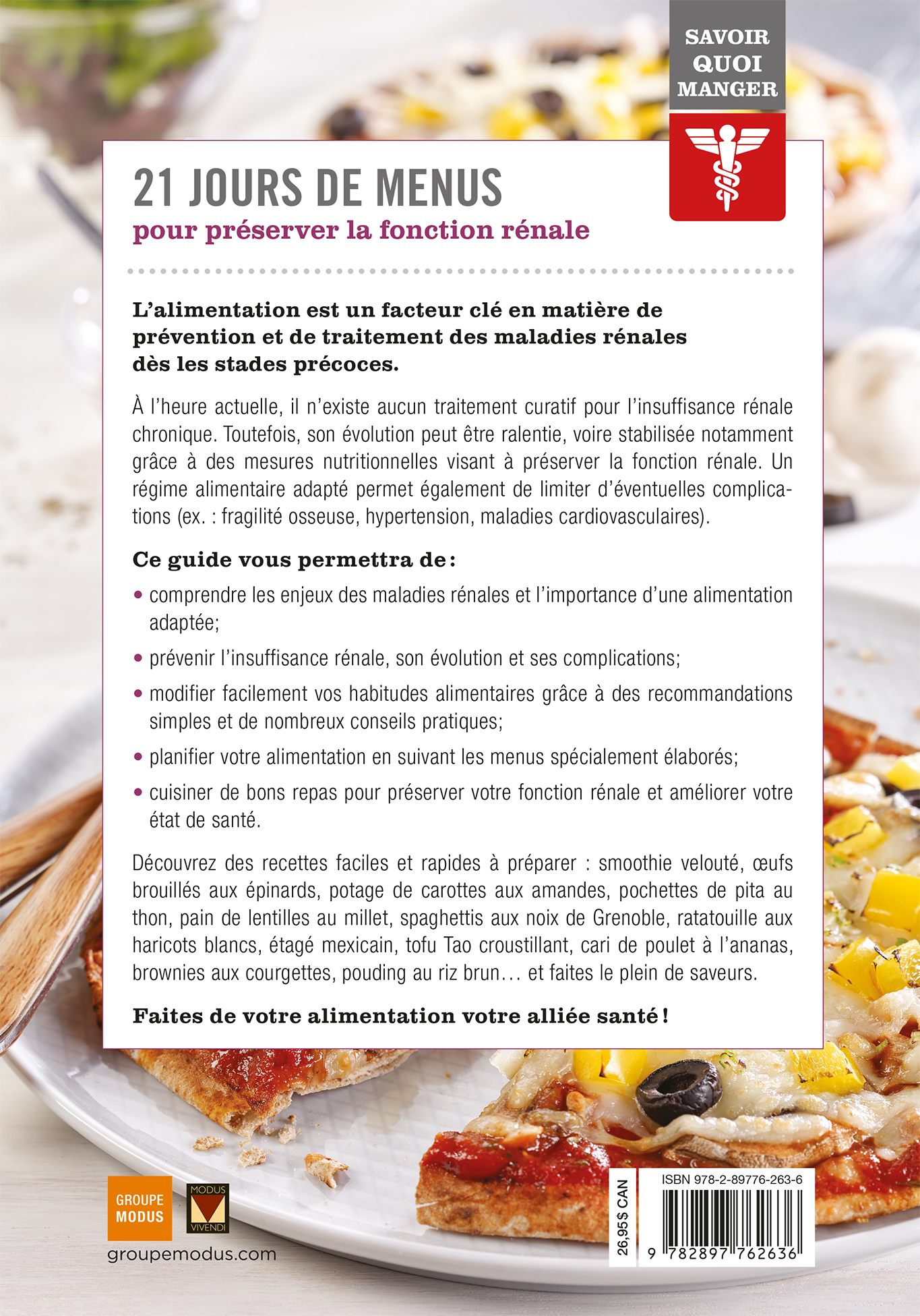 Savoir quoi manger - Santé rénale, un ouvrage qui propose 21 jours de menus équilibrés et 50 recettes faciles et rapides à cuisiner.