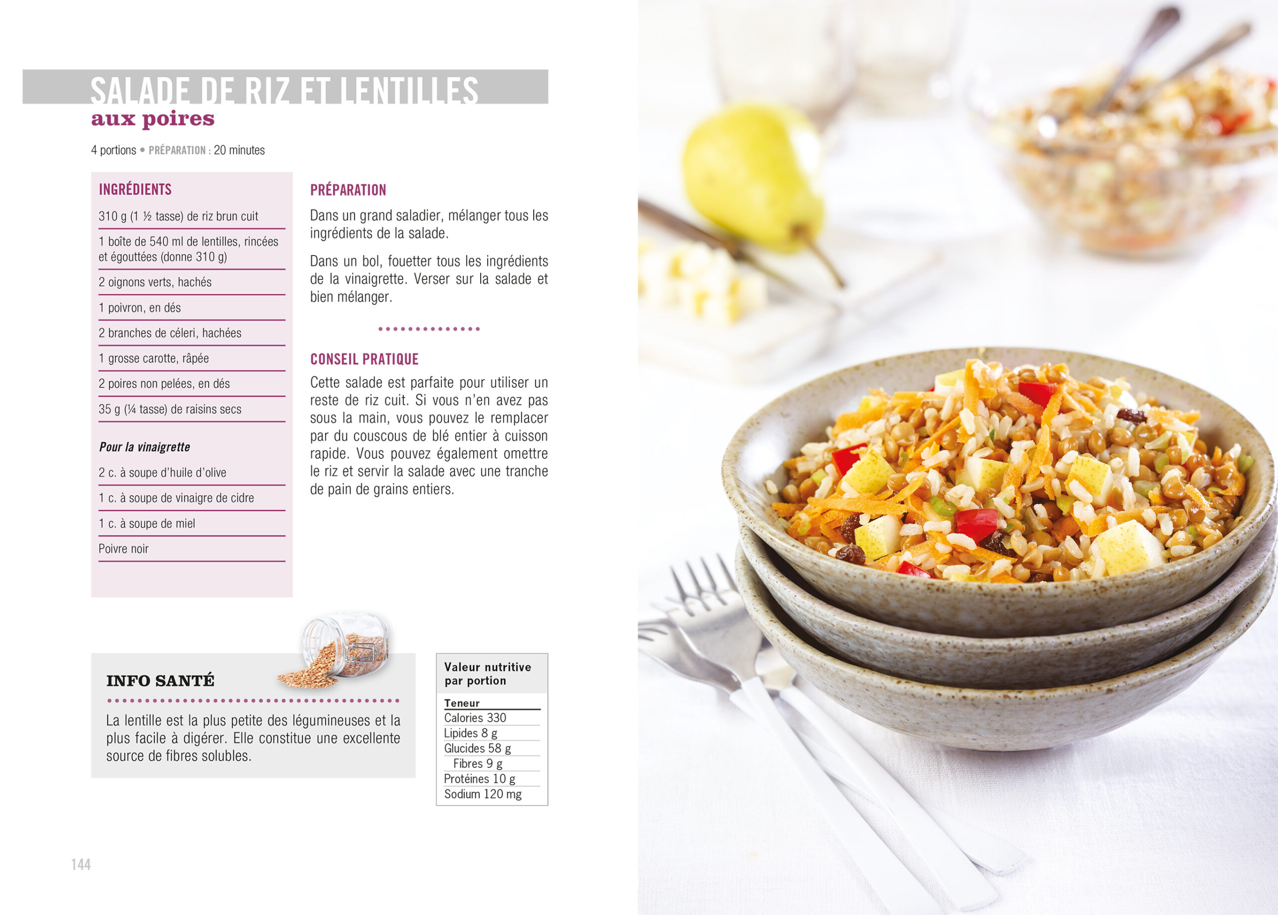 Découvrez des recettes faciles et rapides à préparer : smoothie velouté, œufs brouillés aux épinards, potage de carottes aux amandes, pochettes de pita au thon, pain de lentilles au millet, spaghettis aux noix de Grenoble, ratatouille aux haricots blancs, étagé mexicain, tofu Tao croustillant, cari de poulet à l'ananas, brownies aux courgettes, pouding au riz brun ... et faites le plein de saveurs.